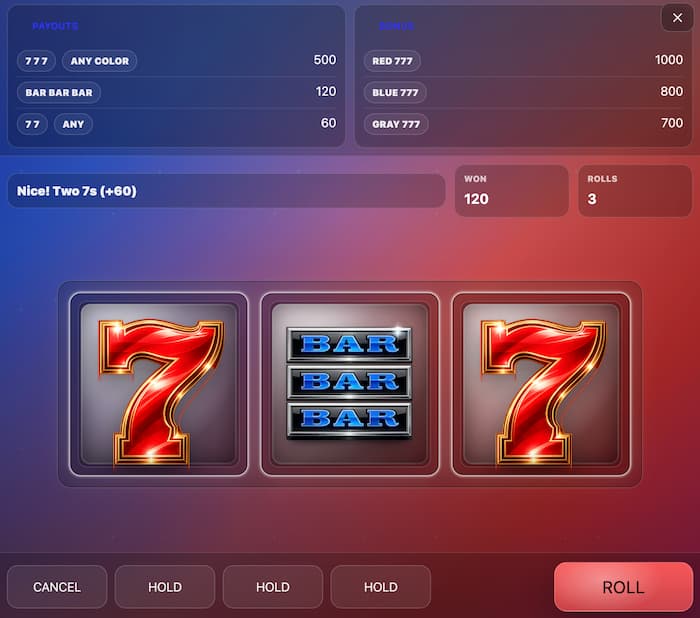 レッド・ブルーのグラデーション背景とクラシックなスロット風の7/BAR演出が融合し、1回ごとのROLLでレトロなカジノの雰囲気を鮮やかに演出します。